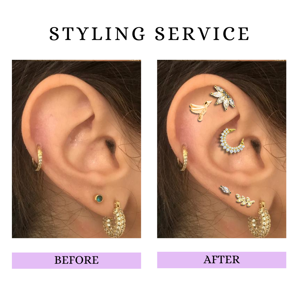This service provides a full ear styling project, with the best piercings and jewelry combination for your ear stack!